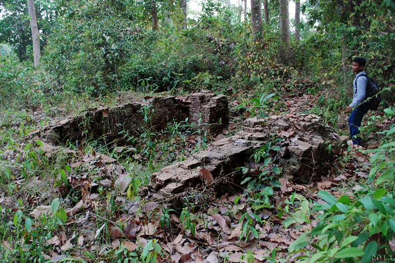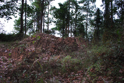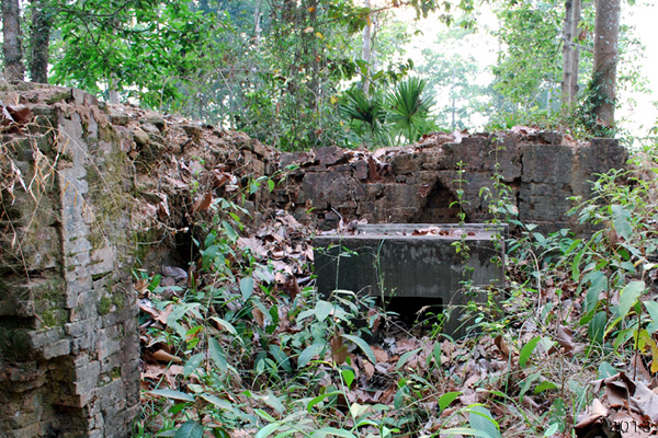 少し土の盛り上がったエリアの藪を掻き分けて20m位進むとレンガが見える。